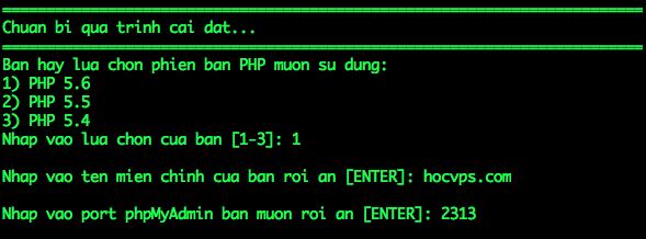 - Thông tin cài đặt đơn giản, chỉ cần lựa chọn phiên bản PHP, tên miền chính và port phpMyAdmin là đủ. Thậm chí bạn không cần nhập password root MySQL vì script sẽ tự động gen.